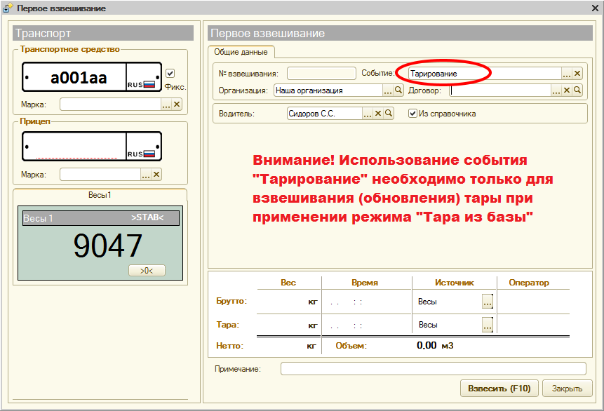 Режим «Тара из Базы» необходим для тех случаев, когда проезд ТАРЫ через весы происходит не каждый раз при загрузке/выгрузке транспорта, а лишь один раз за определенный период. Данный режим позволяет в два раза сократить время на взвешивание и расчет НЕТТО, но повышает риск получения недостоверного значения НЕТТО, т.к. ТАРА со временем может перестать быть актуальной. Применяется, как правило, для собственного транспорта предприятия, когда требуется сократить проезды по весам, а изменения значения ТАРЫ собственных ТС можно отследить с минимальным отклонением. Период обновления значения ТАРЫ (Тарирование) производится регламентно (например один раз в неделю или месяц), в остальном все взвешивания это БРУТТО.