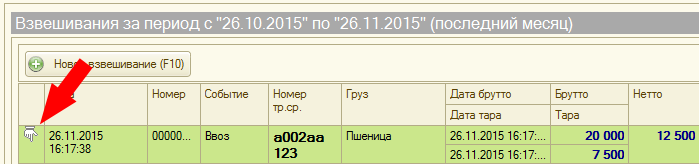 Взвешивание завершено. Теперь в журнале оно будет отображаться зеленым цветом(завершенное взвешивание). В случае необходимости (если есть права) вы можете открыть документ взвешивания в журнале для редактирования.