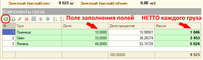 В закладке «Характеристики» можно вести расчет по объему и расчет чистого значения веса с учетом плотности, сорности или влажности. Также реализована возможность разделения груза по компонентам.