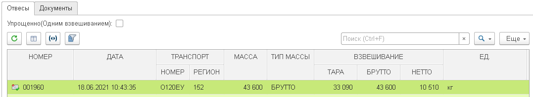 В журнал добавляется строка с новым взвешиванием (выделенная зеленым цветом). Если запись не появилась, нажмите кнопку «Обновить» на панели журнала.
