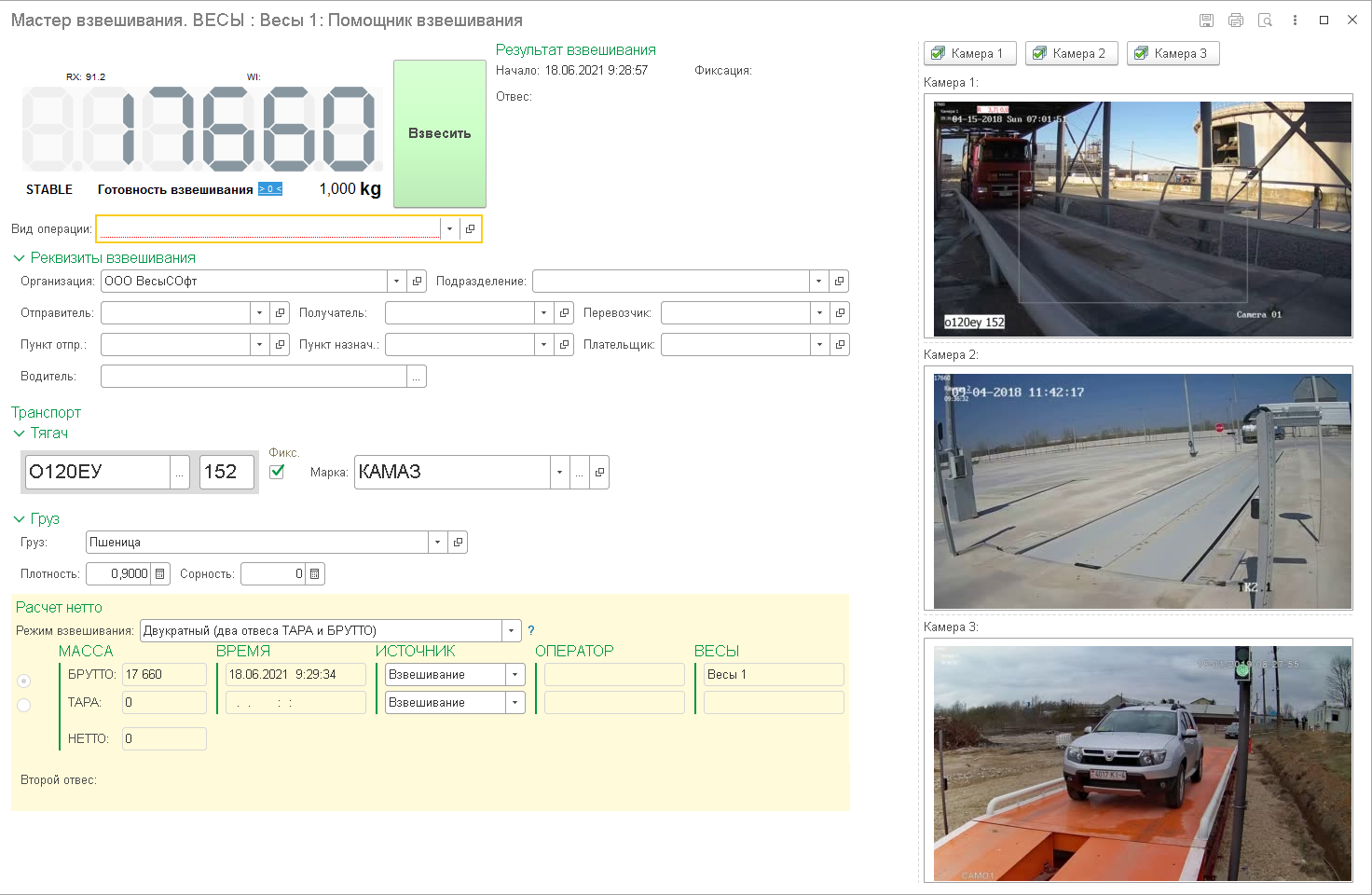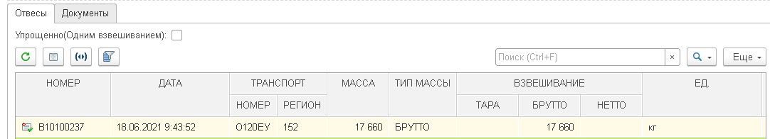 По умолчанию результат первого взвешивания автоматически запишется в БРУТТО. После второго взвешивания система сама определит, какому типу соответствует каждый отвес ТАРА или БРУТТО, и рассчитает НЕТТО. Исправлять или выбирать тип взвешивания (ТАРА или БРУТТО) не требуется.