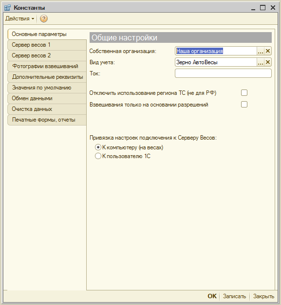 Пункт «Привязка настроек подключения к Серверу Весов» предназначен для того, чтобы определить каким пользователям доступно подключение к весам: Если указано «К компьютеру (на весах)», то подключение к веса доступно любому пользователю конфигурации. Если выбран параметр «К пользователю 1С», то настройка подключения к весам действует только на пользователя, под которым производится настройка