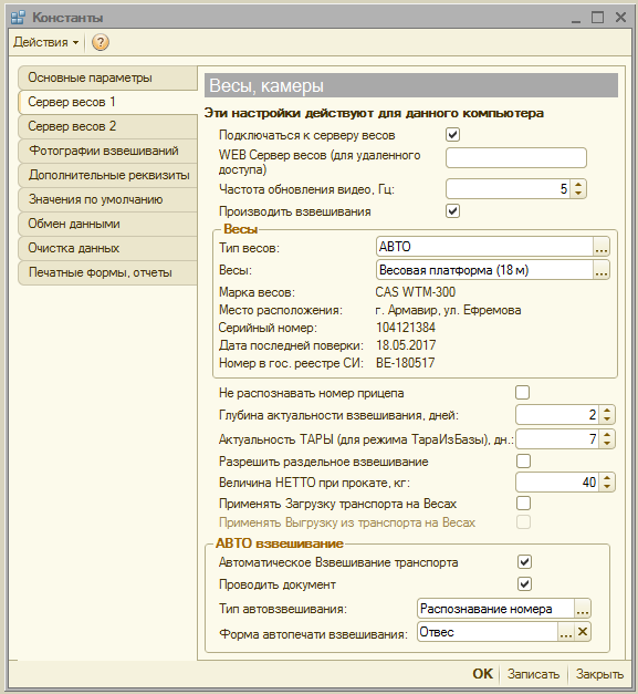 - Тип автовзвешивания: распознавание номера, кнопка пульта и считыватель меток. По умолчанию, рекомендуем использовать «Распознавание номера».