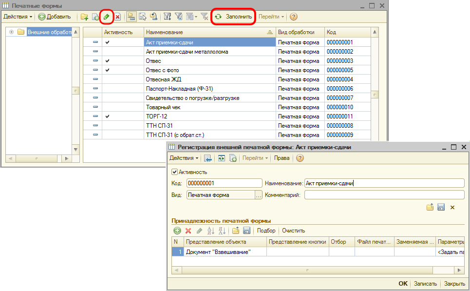 Если таблица печатных форм пустая, на панели инструментов нажмите кнопку «Заполнить»