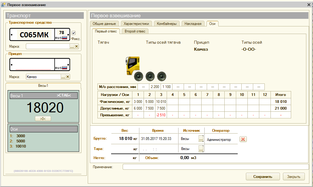 - Происходит автоматическое занесение номера ТС в форму мастера взвешивания.