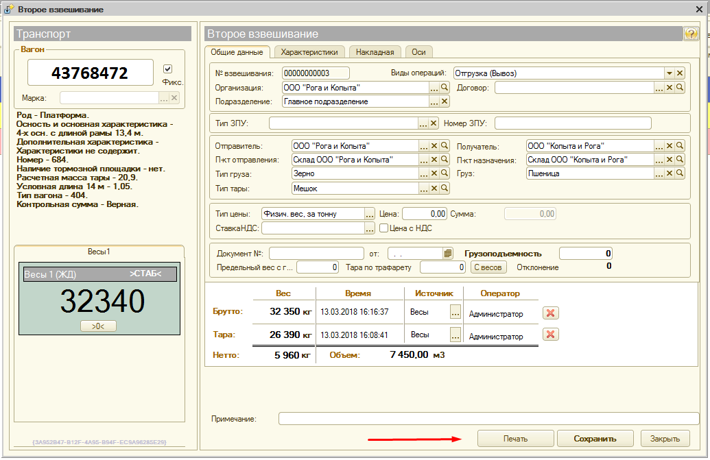 - Не закрывая окна взвешивания, можно распечатать отчеты по взвешиванию. Для этого нажмите кнопку «Печать».
