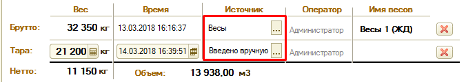 Если тара вагона известна и тарировать вагон на весах не нужно, то можно ввести значение тары в мастере взвешивания вручную с клавиатуры.Чтобы ввести значение тары для вагона вручную, необходимо в графе «Источник» указать «Введено вручную». Режим ввода значения веса вагона вручную применяется только в случаях, когда произвести тарирование на весах не представляется возможным и требует установки соответствующих прав для пользователя.