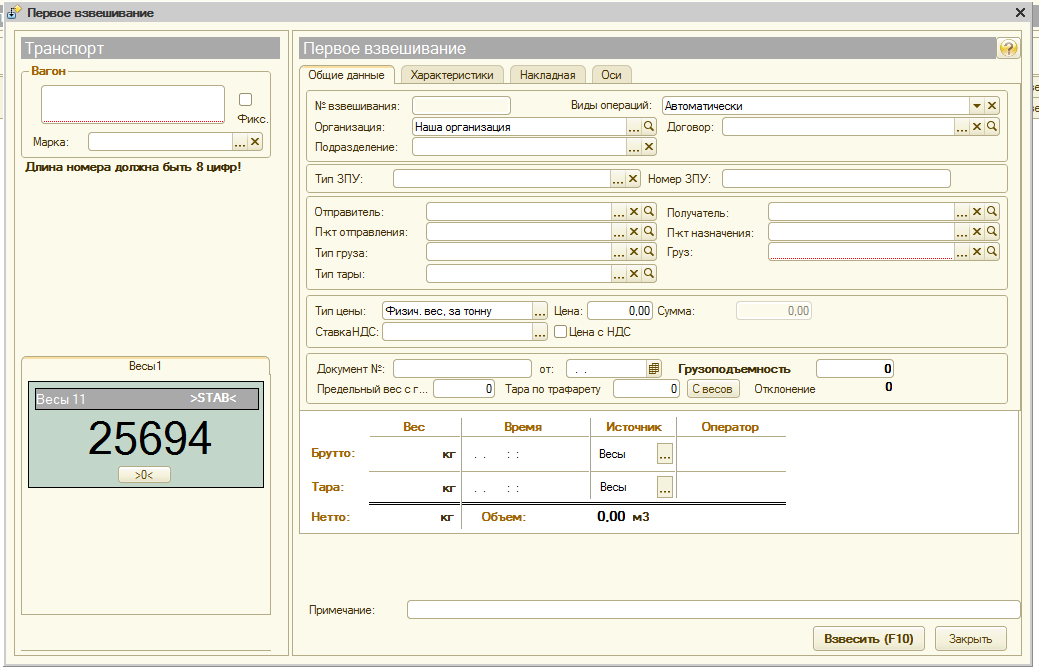 - После того как вагон заехал на весы, введите его номер. Если с данным вагоном ранее проводилась операция взвешивания, произойдет автозаполнение полей записи.