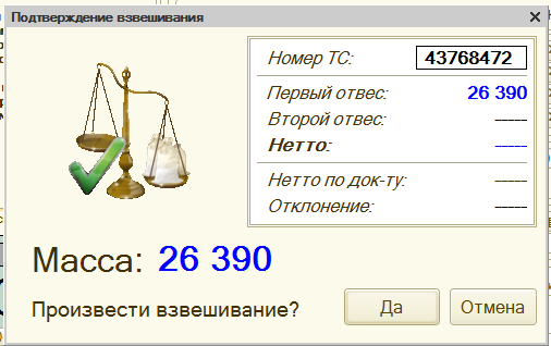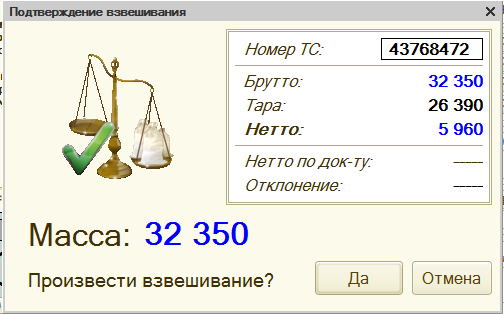 - После стабилизации значения веса появляется окно подтверждения. В окне подтверждения взвешивания проверьте еще раз массу и нажмите «Да».