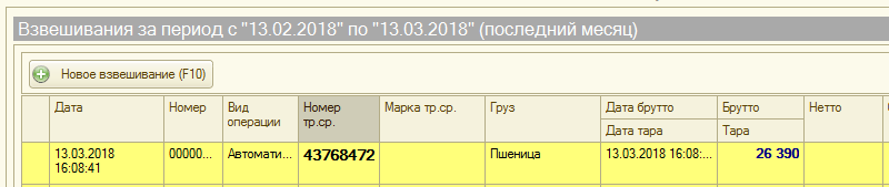 В журнал добавляется строка с новым взвешиванием (желтым цветом обозначается незавершенное взвешивание).