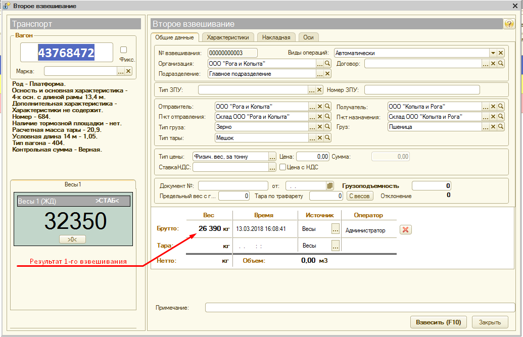 - Система автоматически определит текущее взвешивание, как второе, для данного вагона. Все закладки и поля с данными и реквизитами будут заполнены автоматически в соответствии с первым взвешиванием. Проверьте результаты первого взвешивания, они будут отображаться на форме. Если их нет, значит номер вагона введен неверно, первое взвешивание не производилось или устарело.