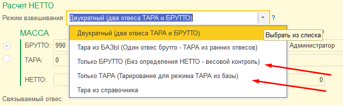 Контрольное взвешивание может быть произведено в двух режимах: Только ТАРА и Только БРУТТО.