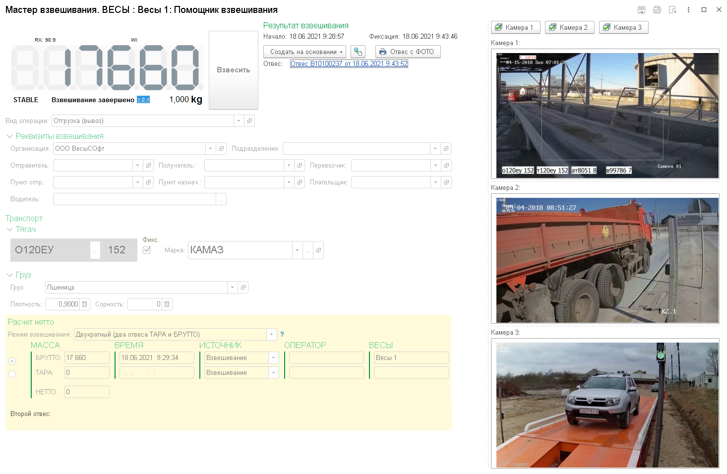 - Происходит автоматическое занесение номера ТС в форму мастера взвешивания.