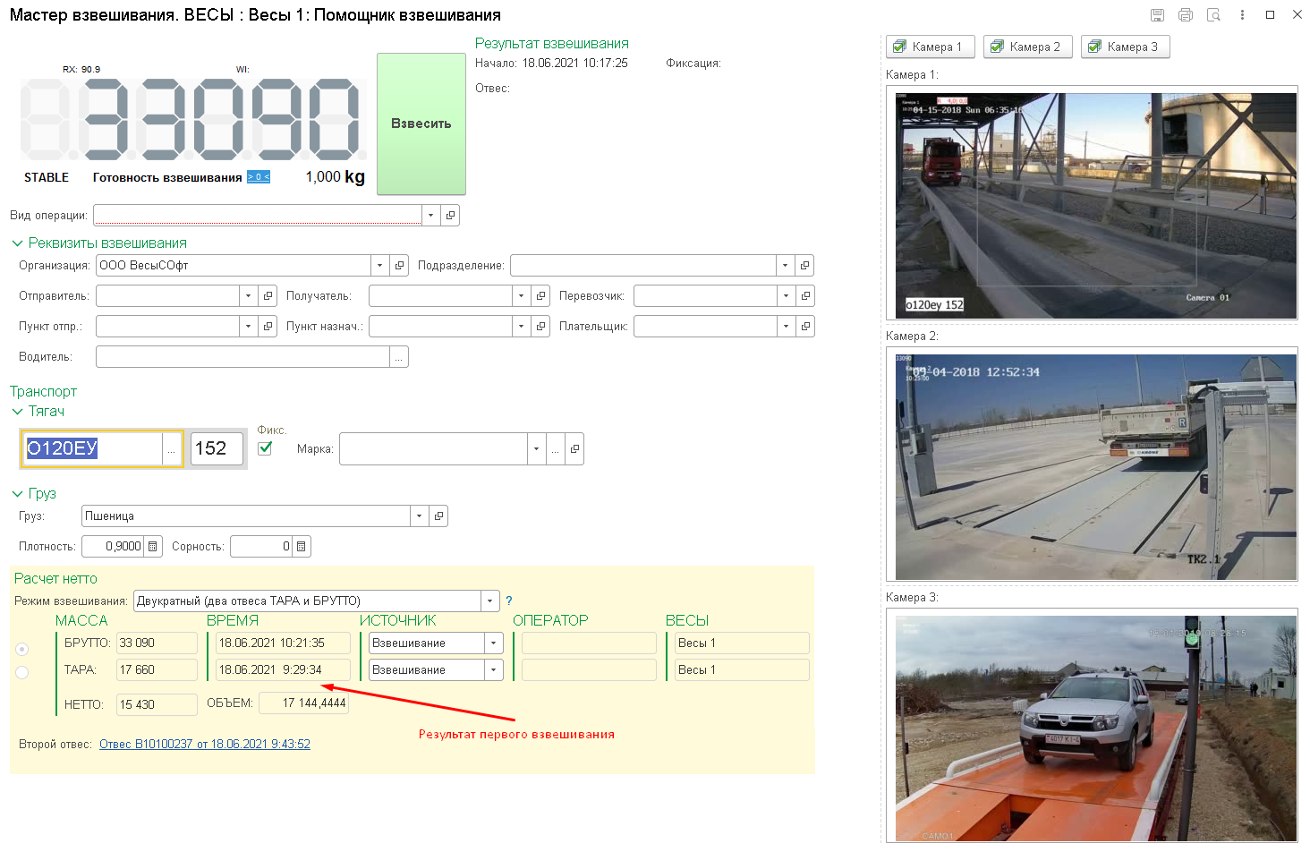 По умолчанию результат первого взвешивания автоматически запишется в БРУТТО. После второго взвешивания система сама определит, какому типу соответствует каждый отвес ТАРА или БРУТТО, и рассчитает НЕТТО. Исправлять или выбирать тип взвешивания (ТАРА или БРУТТО) не требуется.