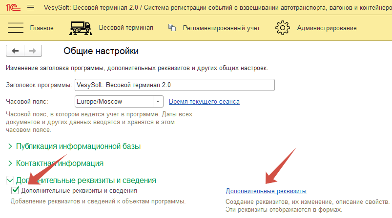 Часто для дополнительного аналитического учета взвешивания грузов существует необходимость в новых реквизитах. Например: «год урожая», «номер поля», «учетная политика». Также необходимо получать выборки и отчеты по новым реквизиты за период по всем взвешиваниям. Для этих целей есть типовой механизм «Дополнительных реквизитов и сведений».