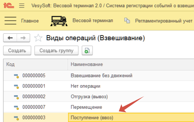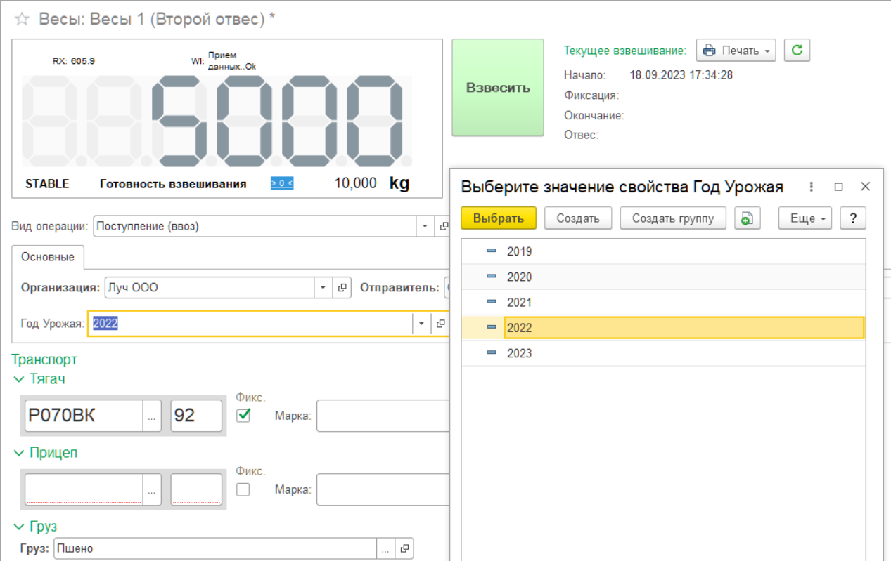 Проделаем все тоже самое, только для дополнительного реквизита «Год урожая», выбрав вид операции выберем «Поступление (ввоз)». И произведём взвешивание.