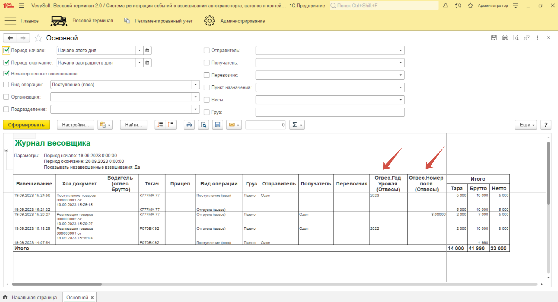 Попробуем использовать созданные дополнительные реквизиты в «Мастере взвешиваний». Для этого произведем несколько проверочных взвешиваний для проверки отображения и функциональности дополнительных реквизитов.