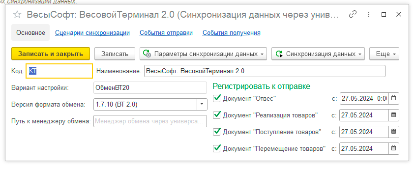 Выбираем Обмен с Vesysoft: Весовой терминал 2.0 и переходим по ссылке Настроить параметры подключения.
