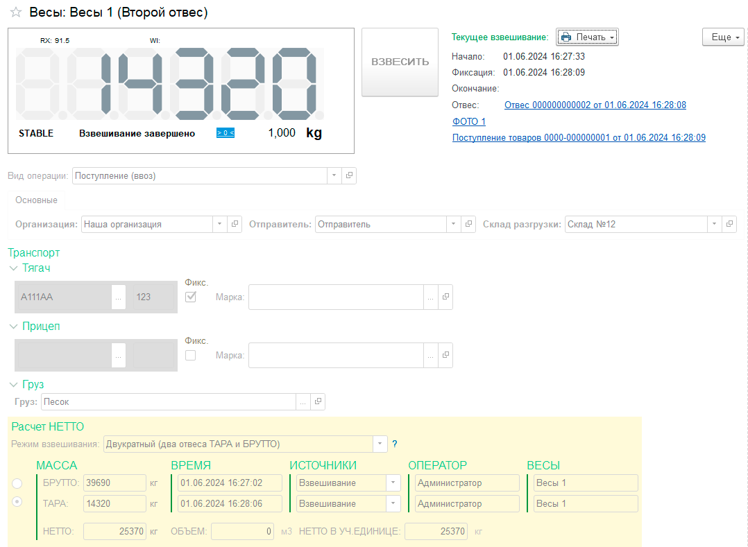 Для примера загрузим данные из одного ВесыСофт: Весового терминал 2.0 в другой. Для начала произведем взвешивания в одной из конфигураций. На основе взвешиваний создается документ реализация товаров.