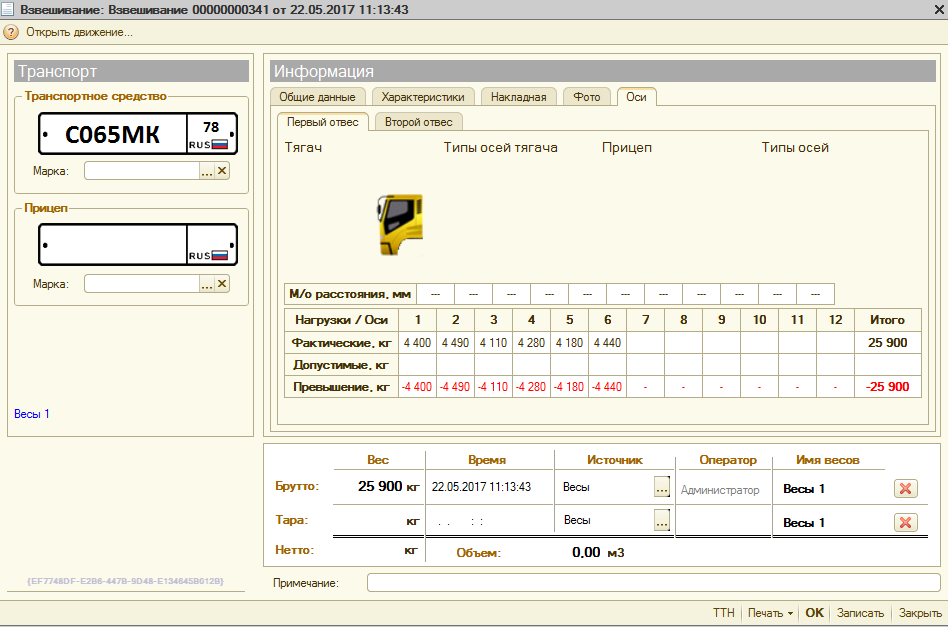 Результаты определения нагрузок на оси в конфигурации 1С "ВесыСофт: Весовой терминал"