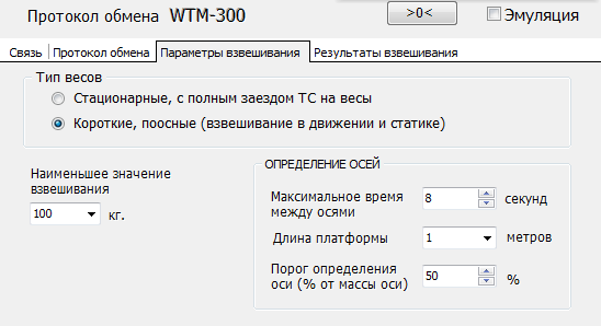 - «Максимальное время между осями» - время, которое программа будет ожидать заезда следующей оси на весовую платформу. Если по истечении этого времени новая ось не заехала на платформу, программа завершит процесс взвешивания и запишет результат в жирнал взвешиваний. (По умолчанию 8 секунд)