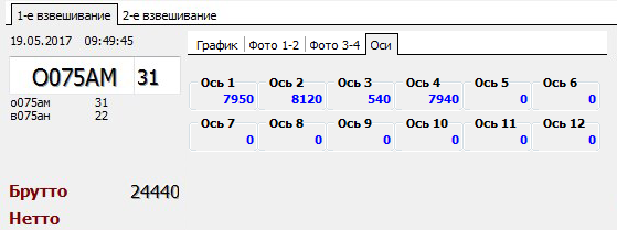 Во время проведения взвешивания ТС, результаты определения нагрузок на каждую ось отображаются в блоке «Оси»