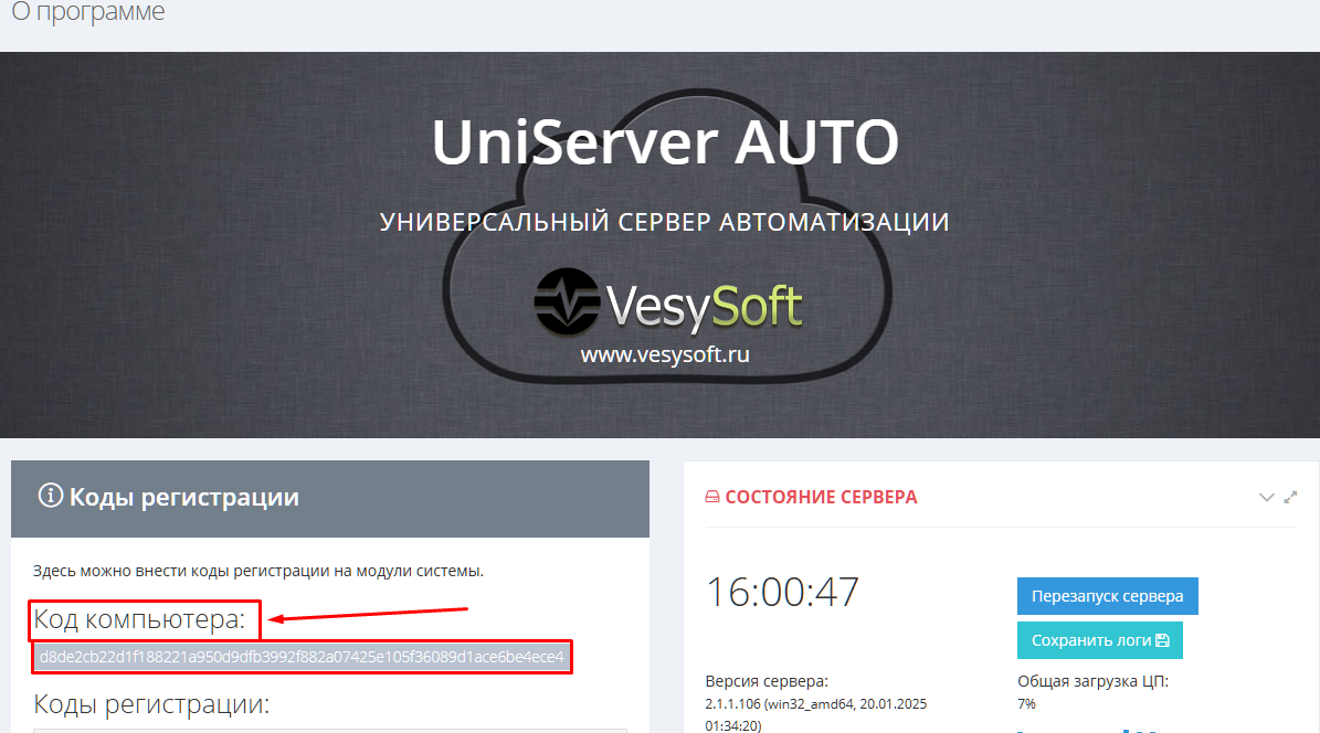 - На странице «О программе» нажмите кнопку «Добавить код регистрации» и введите полученный код. После этого нажмите F5 (обновить) и на странице отобразится информация о лицензии.