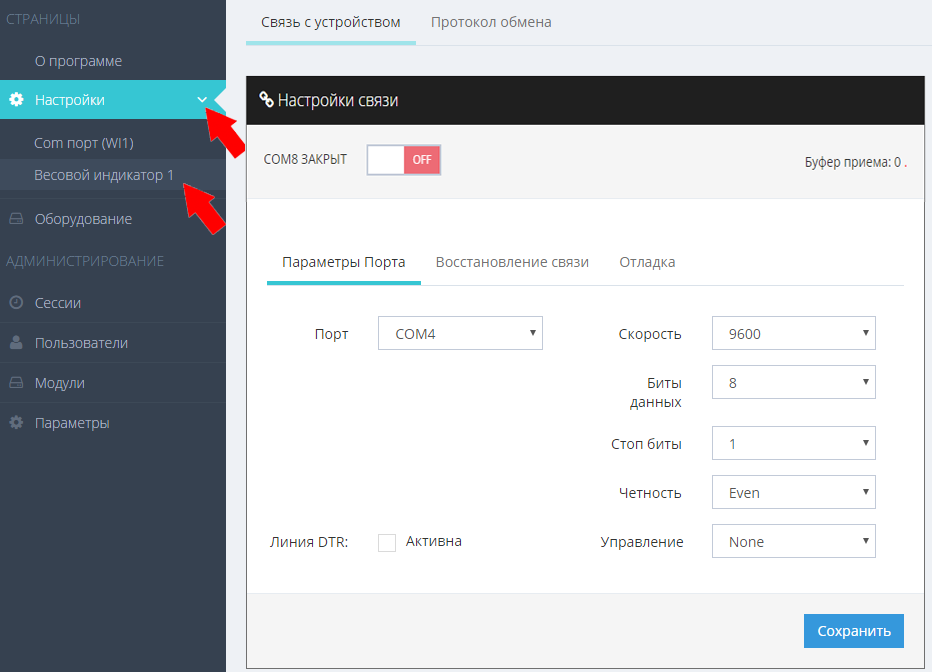 Если Вы впервые настраиваете связь с новым устройством, то рекомендуем перевести весовой индикатор в режим непрерывной передачи данных (согласно инструкции на прибор). Так будет проще настроить связь.