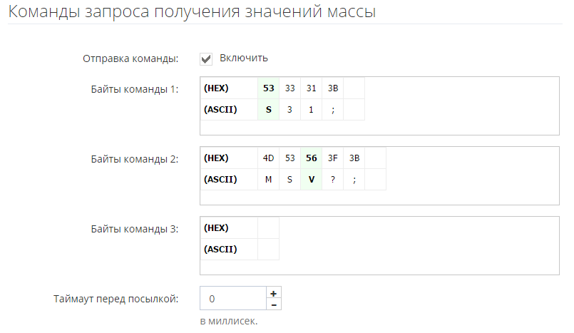 Для настройки перейдите в раздел «Протокол обмена» на вкладку «Запрос на передачу» и заполните список байт на запрос данных о взвешивании согласно руководству к весовому индикатору и установите галочку «Отправка команды».