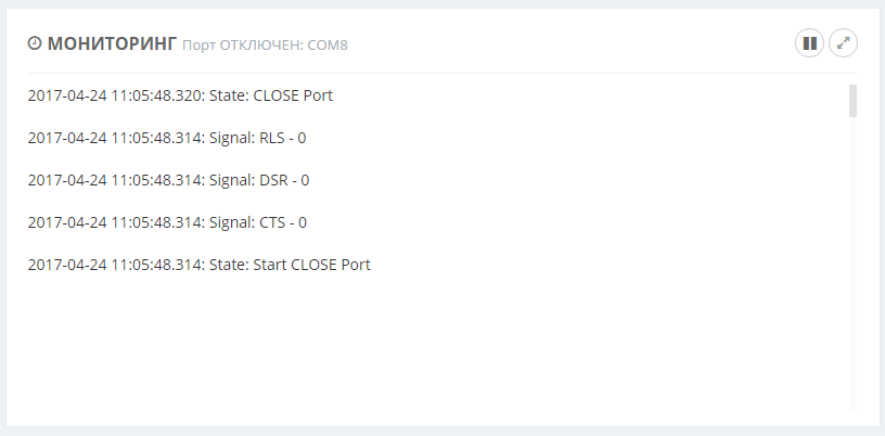 В окне мониторинга обмена данными будут видны данные приема (выделены синим цветом). В строке состояния надпись «Ошибка синхронизации данных!»