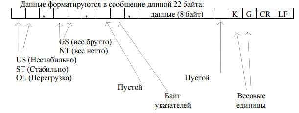 Согласно инструкции на весовой индикатор, пакет данных, передаваемых на компьютер формируется в следующем порядке:
