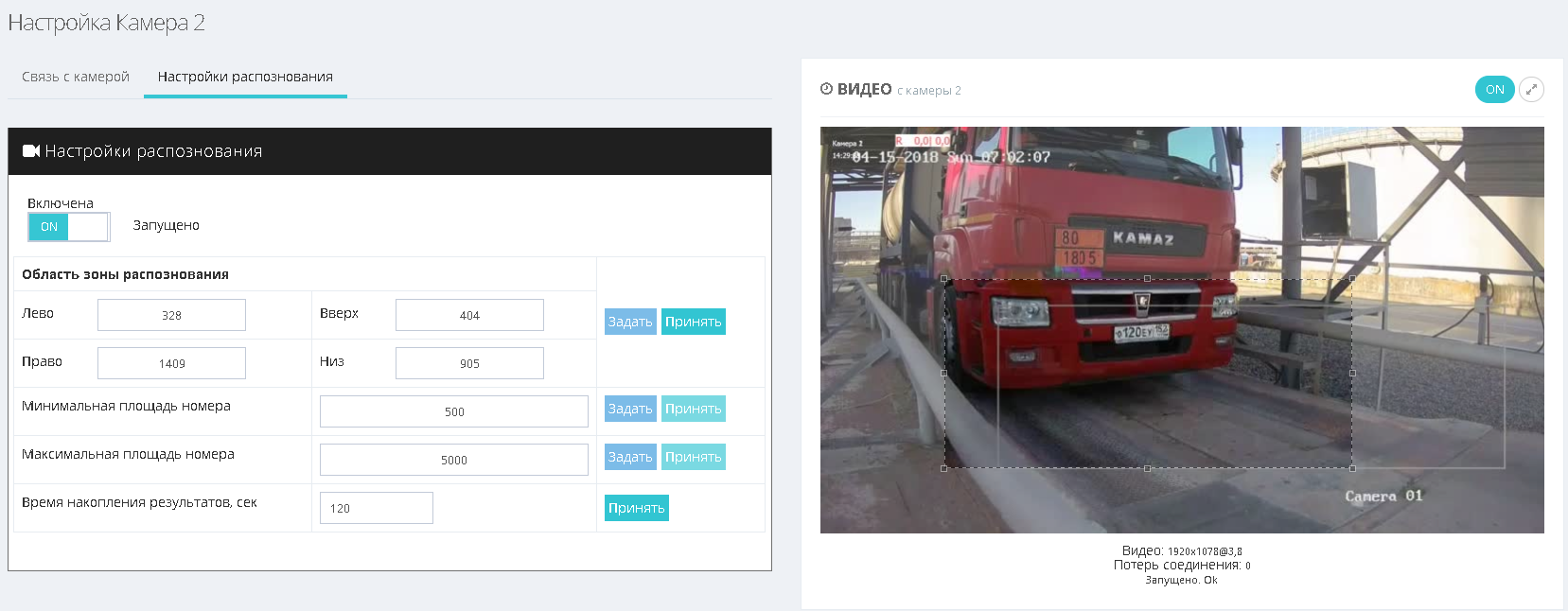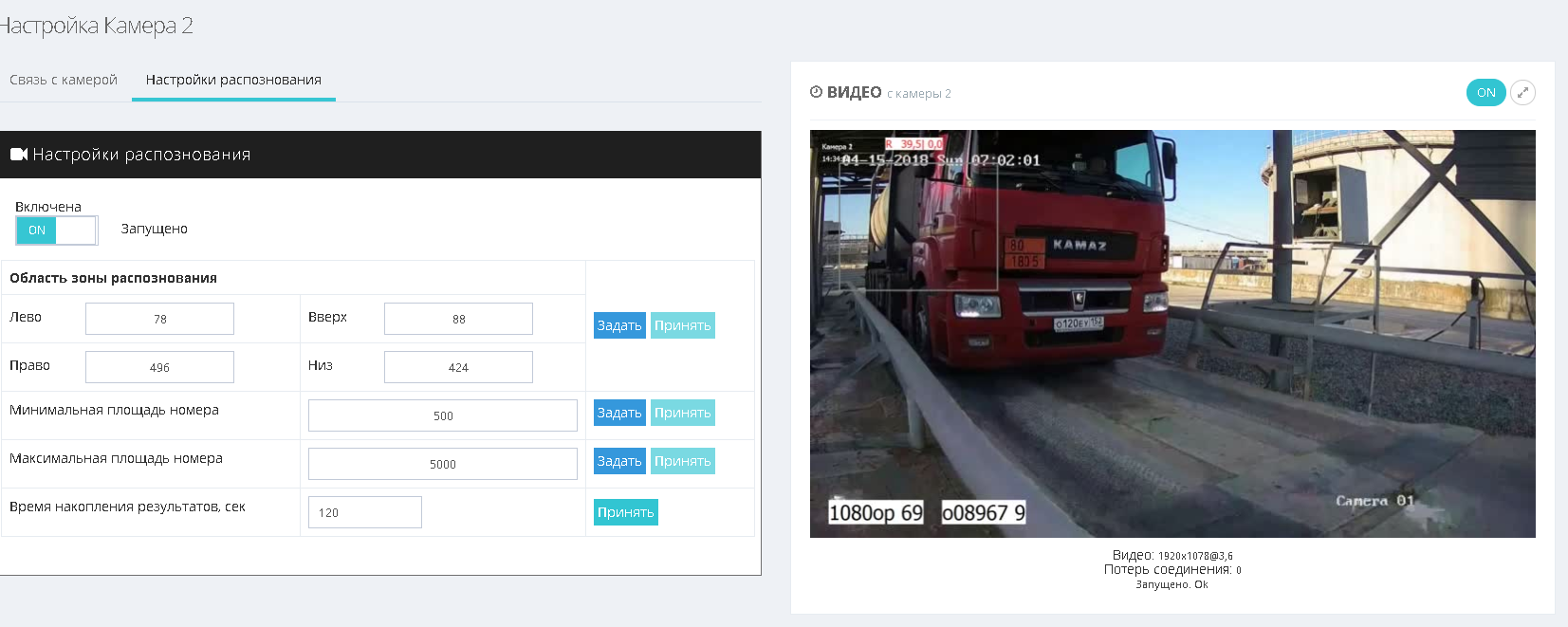 - Для настройки системы распознавания номеров откройте пункт меню «Настройки» → «Камера», и перейдите на вкладку «Настройки распознавания»
