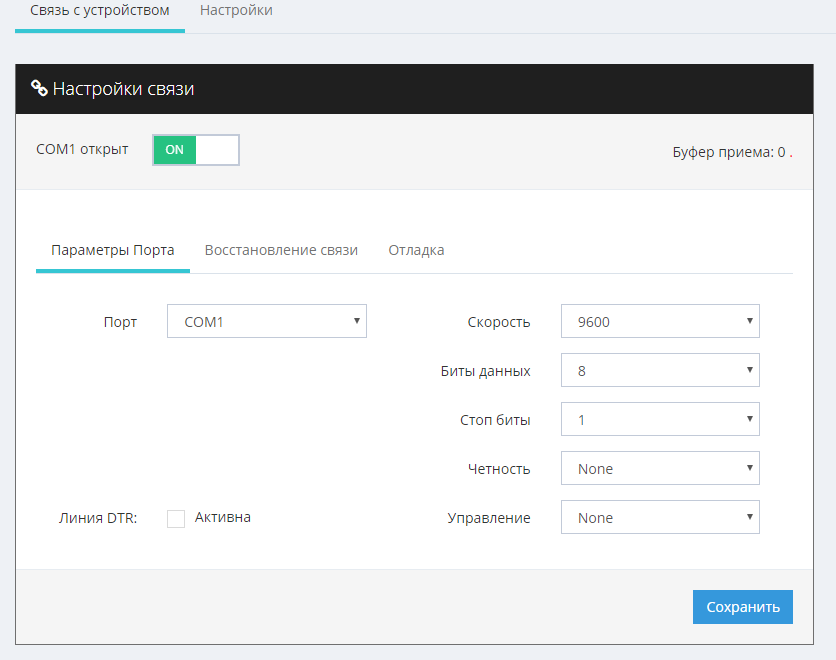 - Перейдите в меню «Настройки» → УДВВ 1. На вкладке «Связь с устройством» произведите настройки связи с УДВВ, установив следующие параметры: