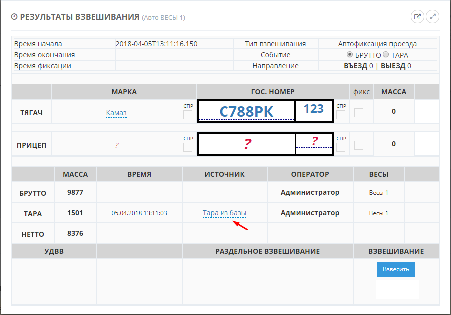 ПО "UniServer AUTO". Пошаговая инструкция для весовщика (режим "Тара из базы")