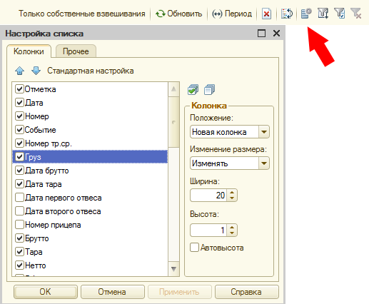 Для удобной работы с журналом взвешиваний необходимо убрать ненужные столбцы (реквизиты), нажав кнопку «Настройка списка» на панели инструментов. А также настроить порядок и режим отображения их в журнале.