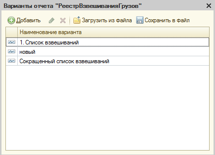 Для просмотра списка всех отчетов нажмите на кнопку «Управление вариантами..». В окне вариантов отчета можно добавить новый отчет, переименовать уже существующий, а также «Сохранить в файл/Загрузить из файла», чтобы использовать его в другой типовой конфигурации 1С, убирая необходимость создавать отчет с такими же настройками и параметрами заново.