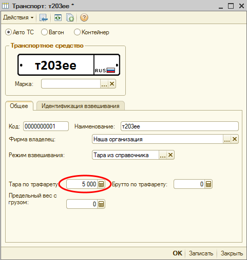 Использование справочника «Транспорт» для предопределенного транспорта в режиме «Тара из базы»