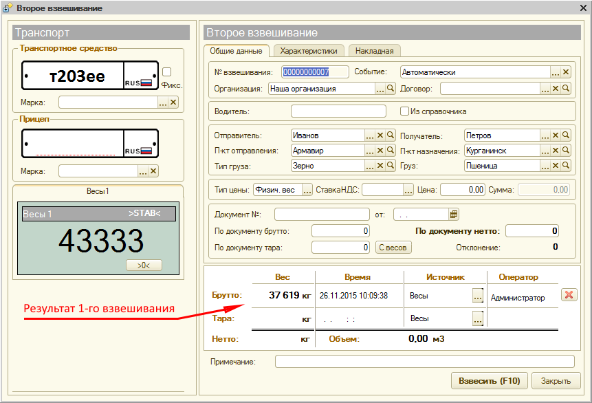 - Заполните номер транспорта, все поля и реквизиты, как обычном режиме взвешивания.