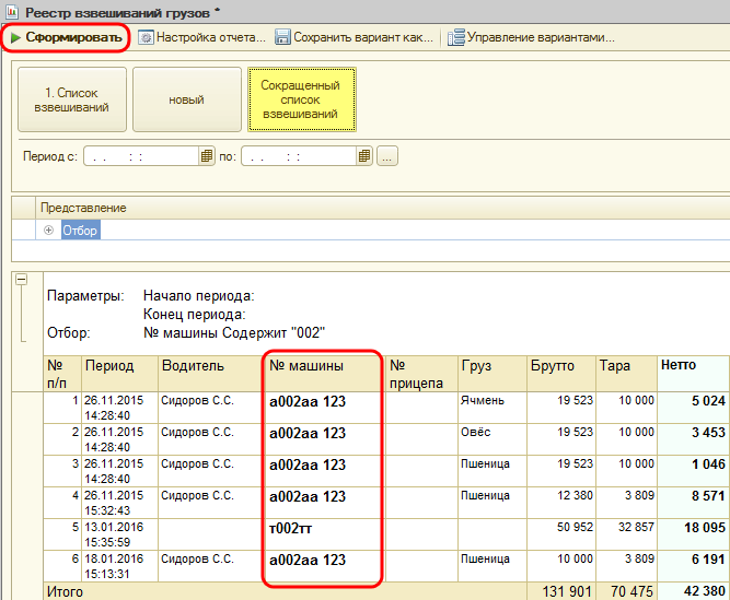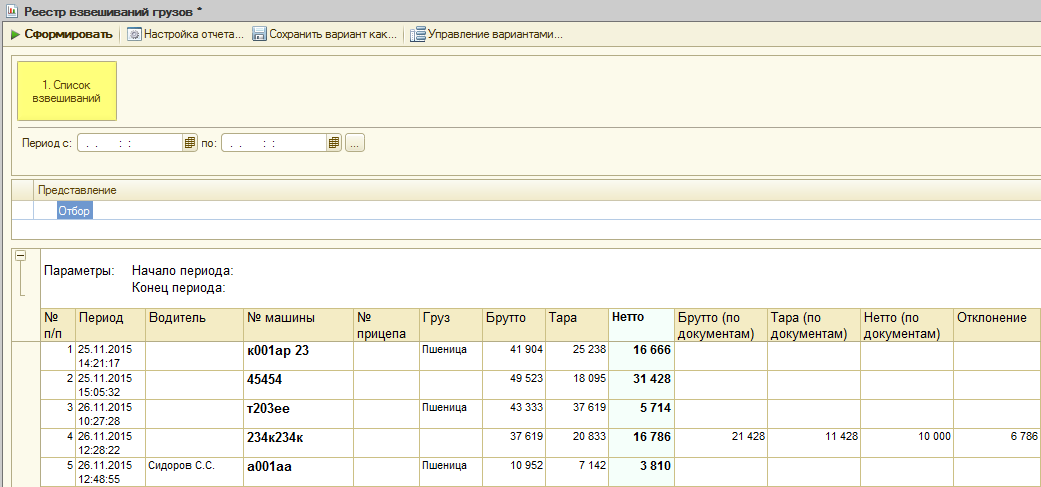 В пакете поставки конфигурации 1С содержится отчет «1. Список взвешиваний». Он является стандартным и позволяет составлять отчет по взвешиваниям смены за выбранный промежуток времени.