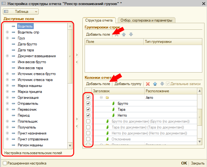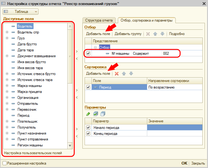 - Отбор, сортировка и параметры. В этих полях задаются параметры, по которым будут отображаться данные при формировании отчета. Для добавления новых параметров используйте кнопки «Добавить поле» и список слева.