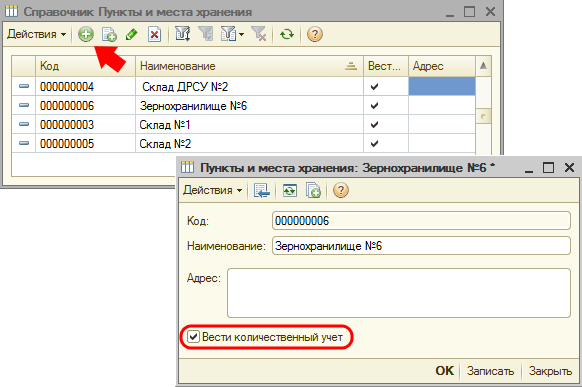 Для начала пройдите в Справочник → Пункты и места хранения и добавьте новый склад в Справочник, указав наименование и поставив галочку «Вести количественный учет».
