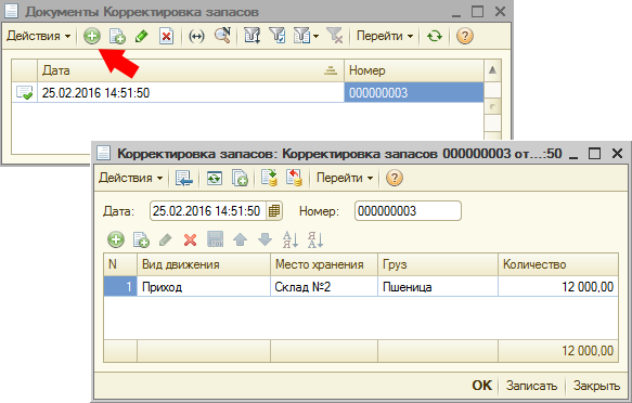 Затем пройдите в Документы → Корректировка запасов и в появившемся окне нажмите кнопку «Добавить». Введите начальный остаток грузов на указанную в документе дату. Приход добавляет в остаток, а расход делает списание. В дальнейшем с указанной в документе даты остатки на складах должны соответствовать фактическим.