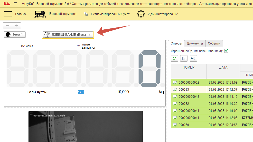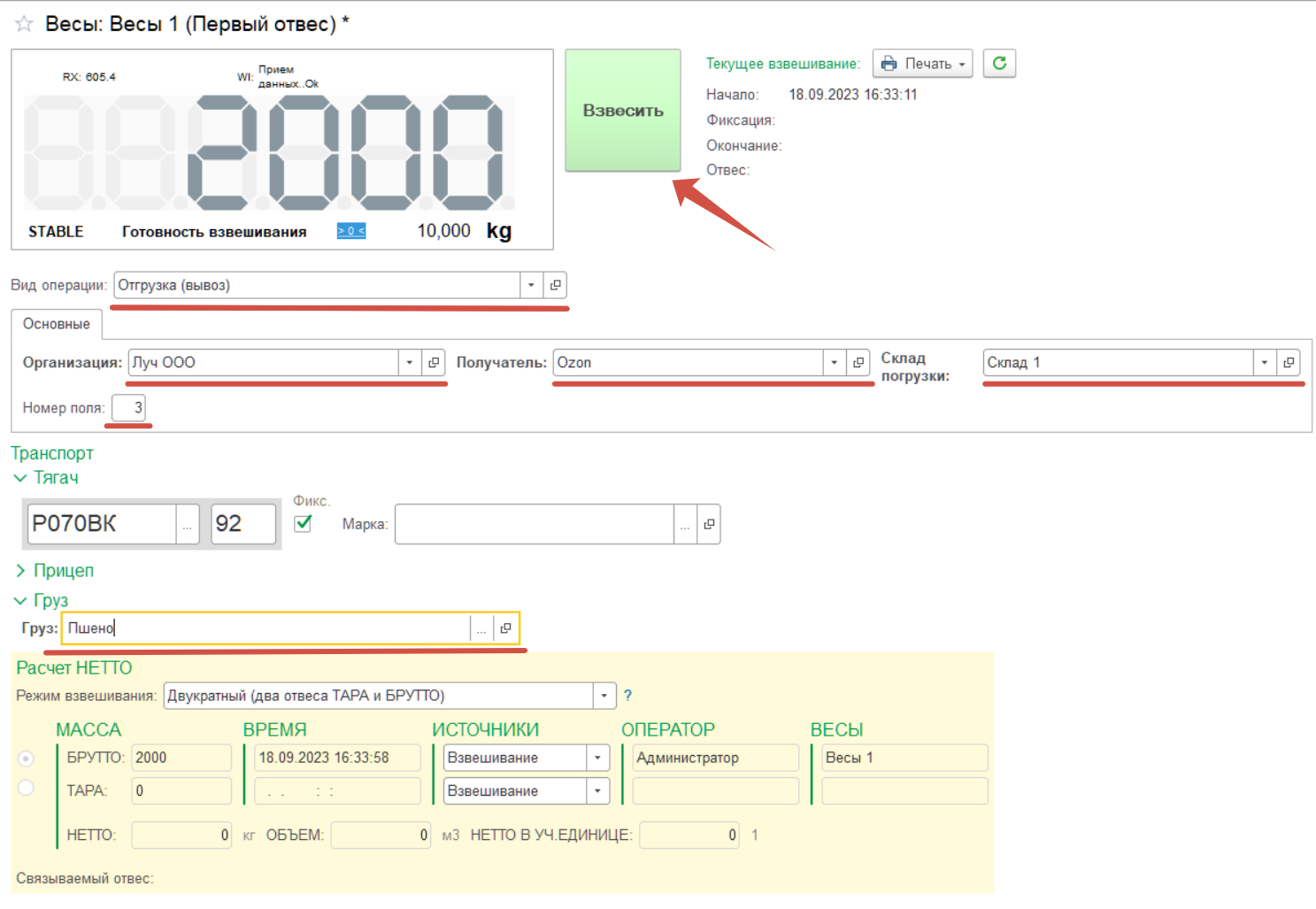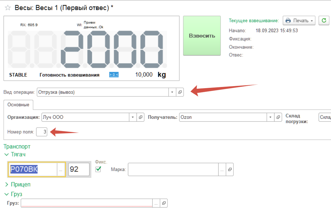 Попробуем использовать созданные дополнительные реквизиты в «Мастере взвешиваний». Для этого произведем несколько проверочных взвешиваний для проверки отображения и функциональности дополнительных реквизитов.