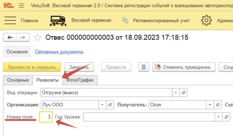 При выборе вида операции (в данном случае «Отгрузка(вывоз)») появился дополнительный реквизит «Номер поля».