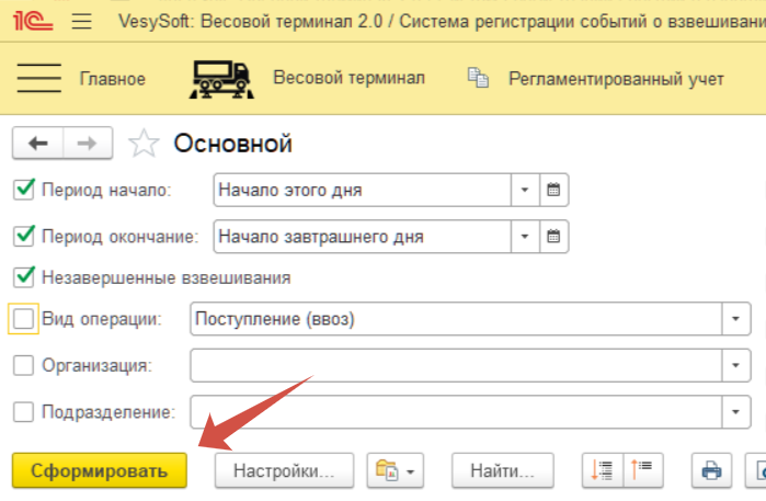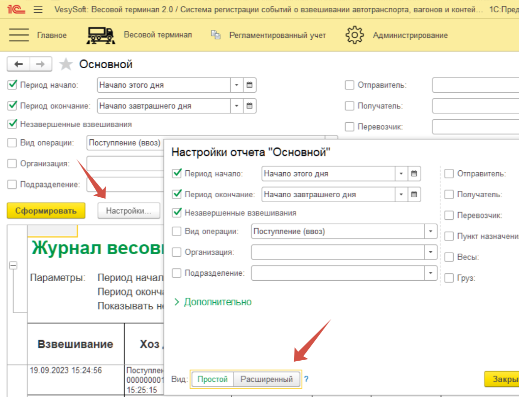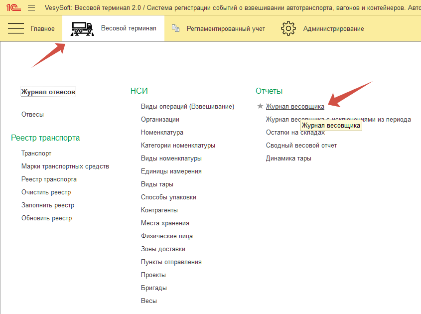 Для формирования отчета по взвешиванию с дополнительными реквизитами необходимо перейти в Весовой терминал–>Журнал весовщика