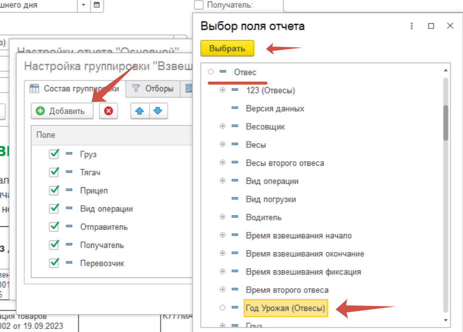 Далее в открывшемся окне нажать на кнопку «Добавить» и в поле «Отвес» выбрать по отдельности созданные дополнительные реквизиты.