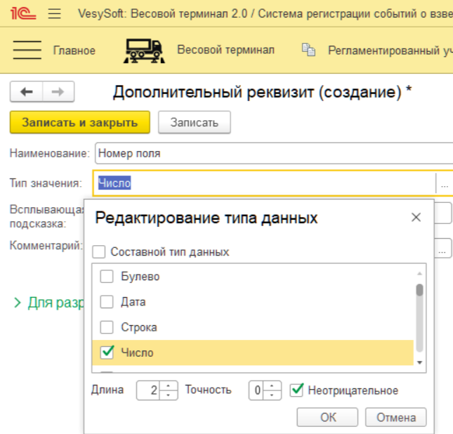 Далее создадим несколько дополнительных реквизитов «Номер поля» и «Год урожая». Для дополнительного реквизита «Номер поля» задаём «Тип значения» → «Число» и выставляем необходимые параметры Длина = 2 и Точность = 0 и устанавливаем флаг Неотрицательное. Далее нажимаем на кнопку «ОК» и «Записать и закрыть».
