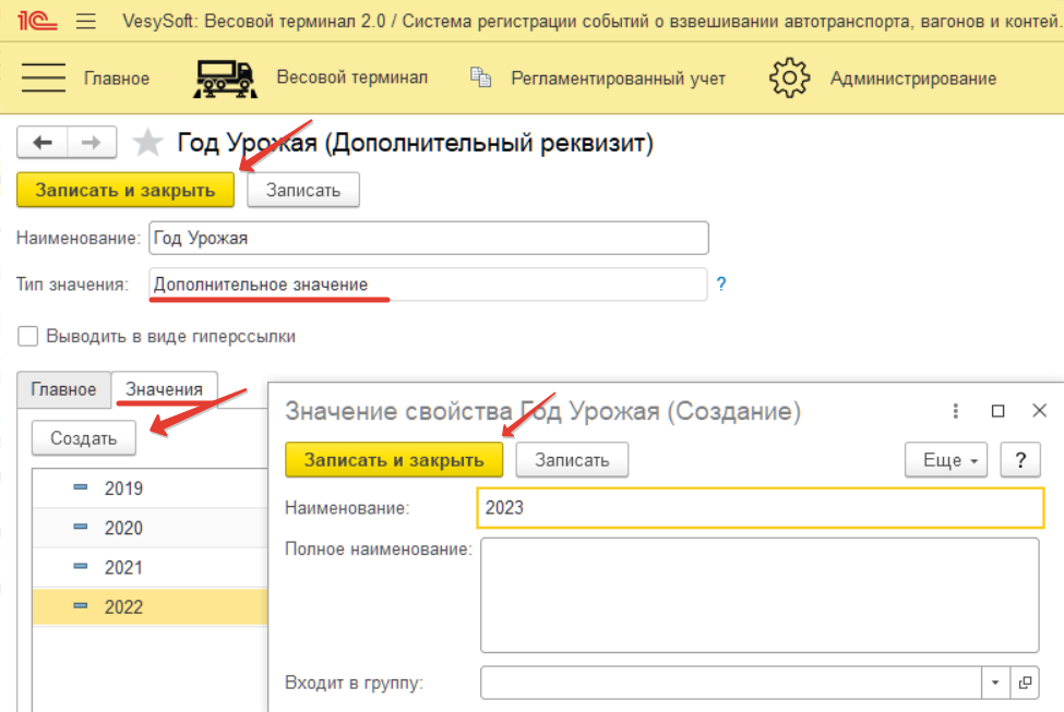 Для дополнительного реквизита «Год урожая» задаём «Тип значения» → «Дополнительное значение», затем нажимаем на кнопку «Записать» и переходим к вкладке «Значения». Во вкладке «Значения» содержится список значений, присвоенных данному реквизиту. Приступим к наполнению «Значения», для это нажимаем на кнопку «Создать», вводим «Наименование» и нажимаем на кнопку «Записать и закрыть». После ввода необходимых значений нажимаем на кнопку «Записать и закрыть».