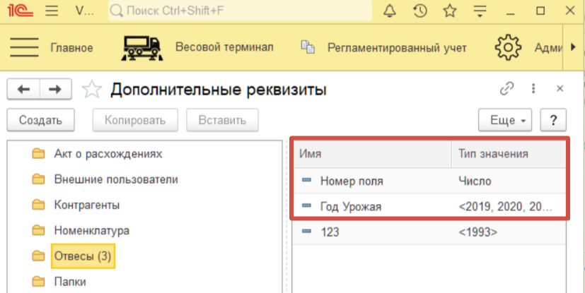 Далее, в этой инструкции рассматриваются варианты создания дополнительных реквизитов документа Отвес, с привязкой к различным видам операций, которые также появятся в мастере взвешиваний и будут использоваться в отчетах. Создадим два дополнительных реквизита «год урожая» и «номер поля». Пройдем все этапы по созданию и формованию в отчетности.