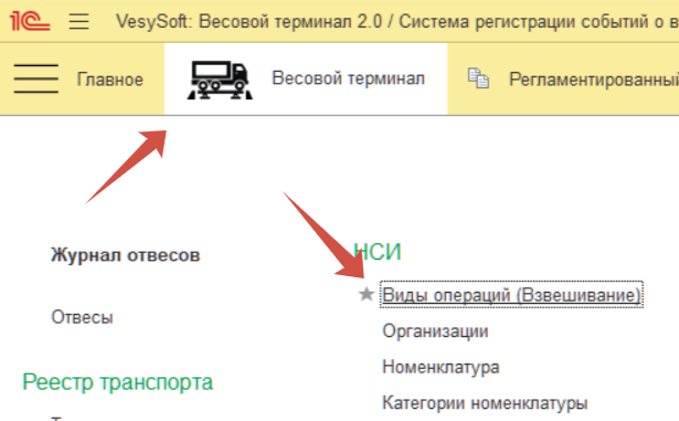 Следующим этапом необходимо настроить видимость созданных дополнительных реквизитов, для конкретного вида операции. Для этого необходимо перейти Весовой терминал → Виды операций (Взвешивание).